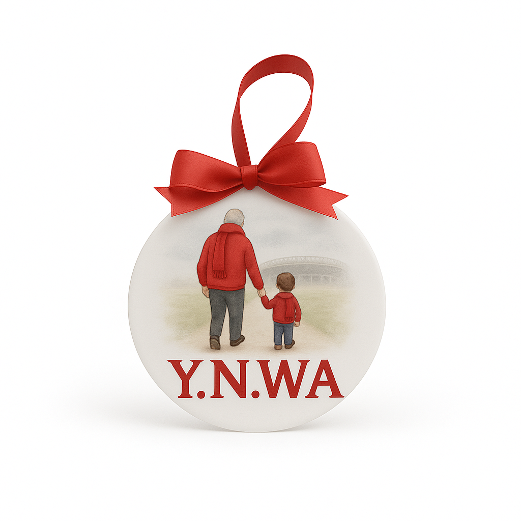 A touching keepsake in memory of a special family member. This beautiful ceramic bauble features a heart-warming illustration of a grandad and young boy walking hand-in-hand towards a football stadium – a symbol of love, memories, and shared match-day moments.
